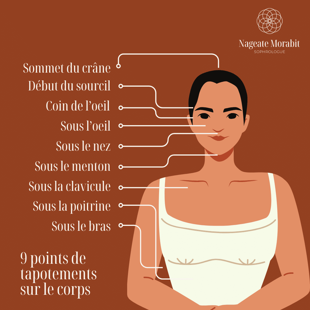 Pour libérer les blocages émotionnels, l’EFT utilise les méridiens énergétiques chinois. Cette technique s’appuie sur certains principes issus de l’acupuncture et de l’EMDR (mouvements oculaires). Cet outil vise à supprimer les émotions négatives en tapotant des points spécifiques d’acupuncture. Assis(e) sur une chaise, vous êtes guidé(e) par la praticienne en EFT qui vous amène à vous focaliser sur le problème pour vous en libérer.